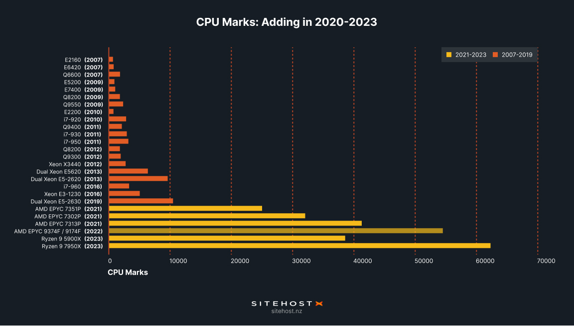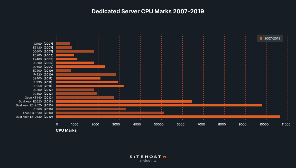 The launch of our new Dedicated Servers got us thinking about how hardware evolves. Exactly how have Dedicated Servers changed over the 15+ years we've offered them? To find out we've looked back as far as the Wayback Machine can take us, to 2007, listed almost every processor (CPU) that we've offered, and checked its performance on CPUbenchmark.net.